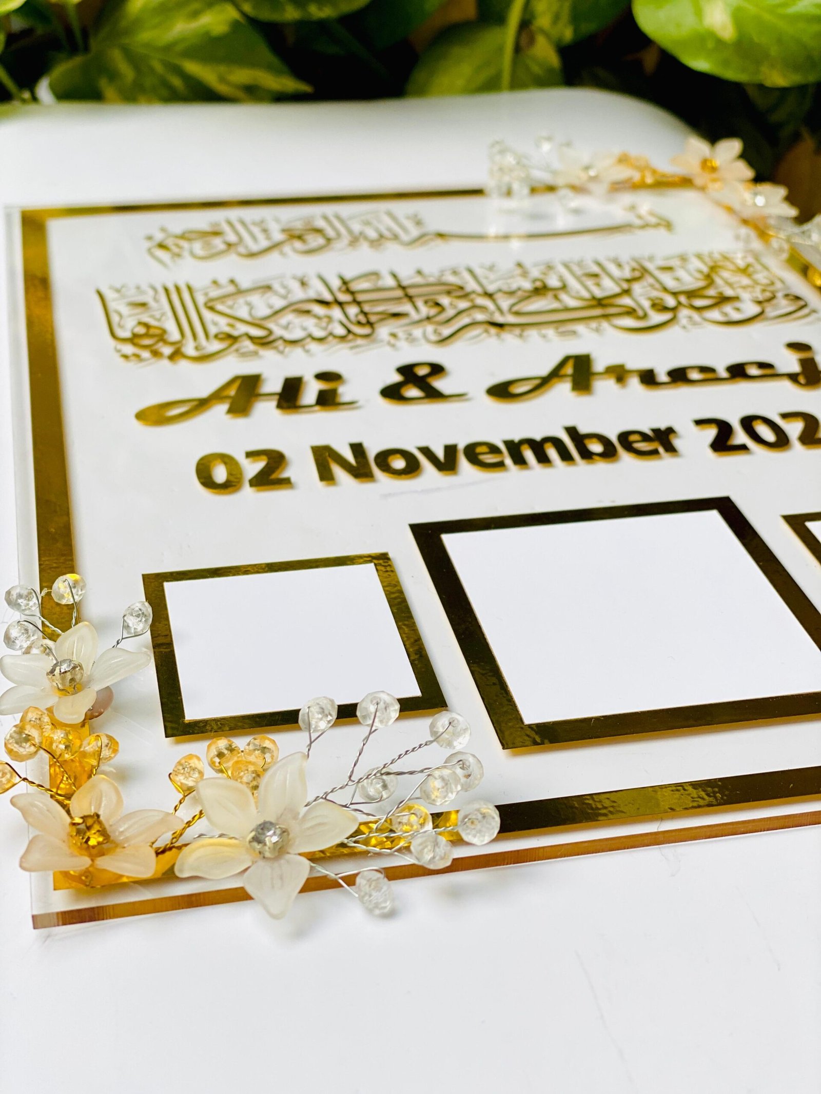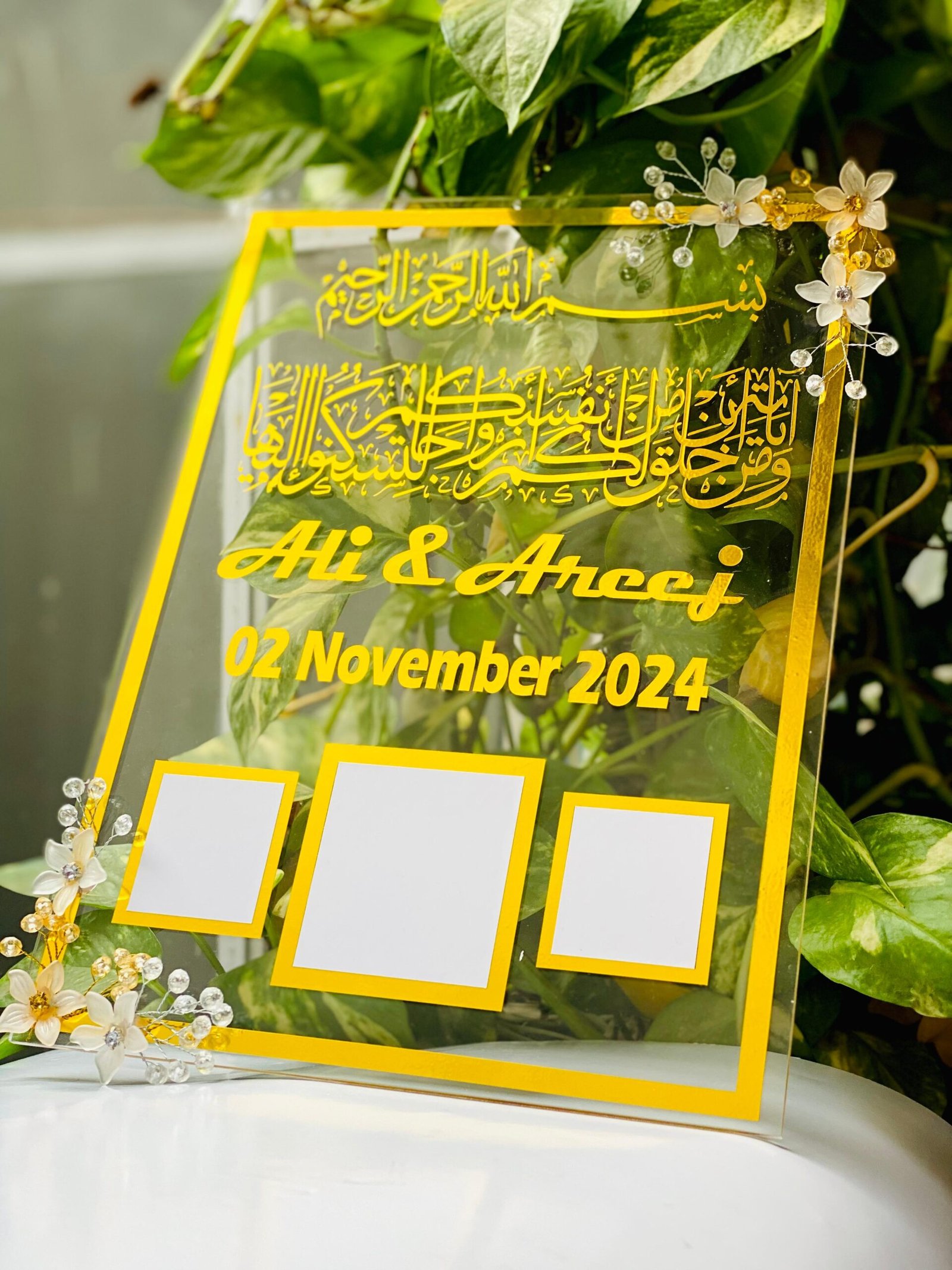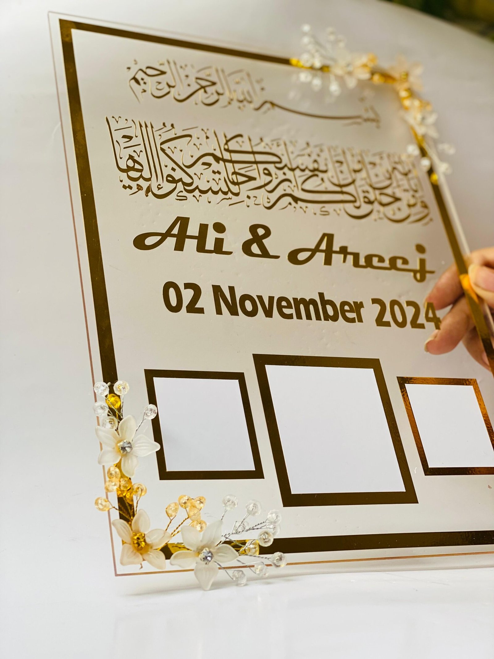 Make your wedding day unforgettable with our Nikkah Acrylic Thumb-board. This stunning, transparent acrylic display is designed to capture and celebrate the magic of your special day. It’s not just a décor piece—it’s a statement of love and connection for your guests to share.